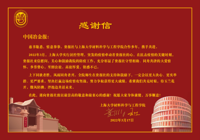 上海大學(xué)材料科學(xué)與工程學(xué)院給中國冶金報社發(fā)來感謝信
