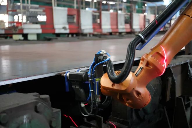 圖為全國(guó)首家中板智能標(biāo)牌焊接機(jī)械臂