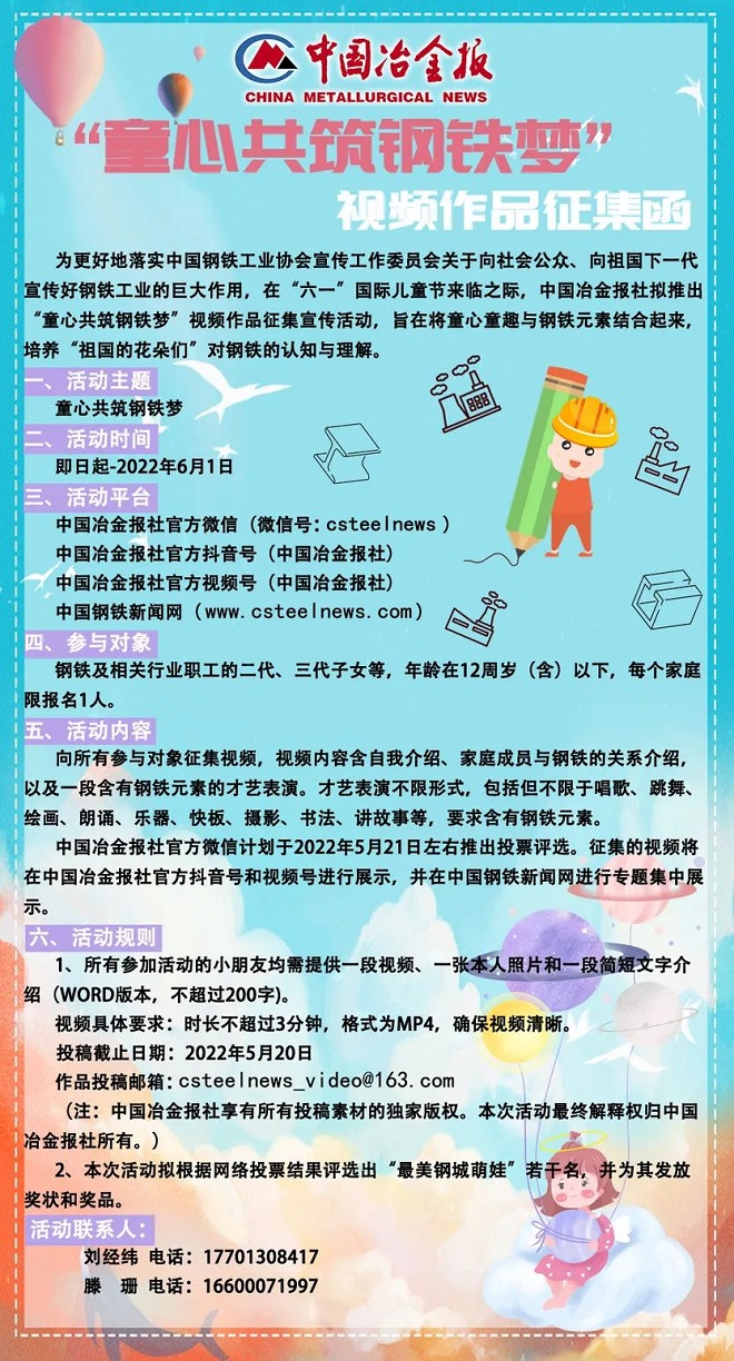 為更好地落實中國鋼鐵工業協會宣傳工作委員會關于向社會公眾、向祖國下一代宣傳好鋼鐵工業的巨大作用的指示,在“六一”國際兒童節來臨之際,中國冶金報社擬推出“童心共筑鋼鐵夢”視頻作品征集宣傳活動,旨在將童心童趣與鋼鐵元素結合起來,培養“祖國的花朵們”對鋼鐵的認知與理解。