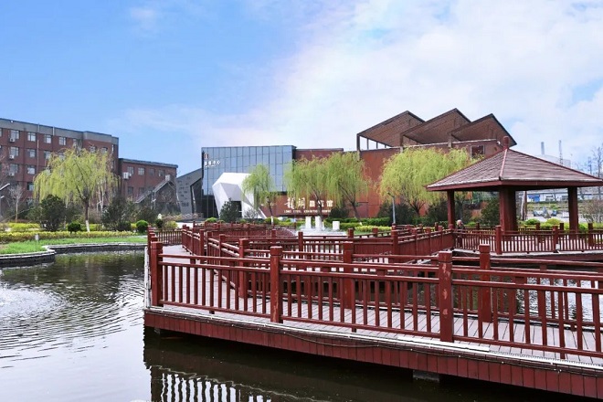 圖為陜鋼龍鋼公司展覽館前人工湖、涼亭棧道 徐顥軒攝