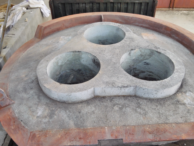 三角區是爐頂的關鍵部位,工作環境最為惡劣,必須要保證材料有較高的純度,所以要求此件需要單獨提前預制。待成型養護到期后脫模,等預制件獲得足夠的強度后再在其周圍澆注外圍部分;外圍部分根據使用環境和易損程度又分為外圍下部和外圍上部兩個部分,外圍下部是熱面,接近鋼液面,材料檔次僅次于中心三角區,外圍上部相對而言為冷面,使用環境基本無異常。