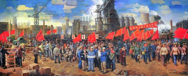 1959年1月19日,《人民日報》發表社論《保證重點支援包鋼》指出:“包鋼是全國建設的重點項目之一,是全國一盤棋中的重要一著。包鋼的建成,對于加速國家工業化進程和改變內蒙古自治區經濟面貌將有極其重大的意義。為此,要求同包鋼有協作關系的各地區、各企業、各部門,如鐵道、電力、煤炭等協作單位,本著過去支援重點企業的精神,給包鋼以大力支援。”同日,《人民日報》還在第一版以《包鋼為全國 全國為包鋼》為題發表了包鋼100多個工程項目加緊建設和鞍鋼支援新基地的報道。以此拉開 了“齊心協力建包鋼”的序幕。圖為描繪當年全國各地支援包鋼“,齊心協力建包鋼”的巨幅油畫。