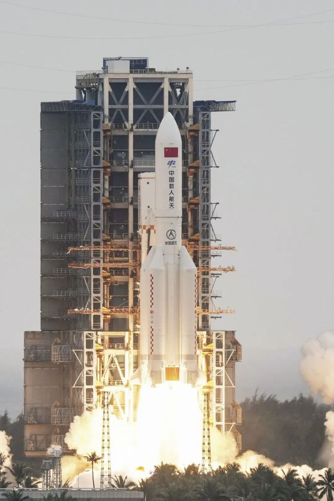 圖為2021年4月29日11時23分,長征五號B遙二運載火箭搭載空間站天和核心艙,在海南文昌航天發射場發射升空。(本報資料圖片)