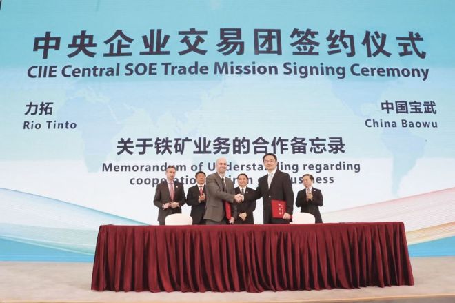 圖為在第二屆中國(guó)國(guó)際進(jìn)口博覽會(huì)上,寶鋼股份和力拓集團(tuán)的代表簽署關(guān)于鐵礦業(yè)務(wù)的合作備忘錄。(本報(bào)資料圖片)