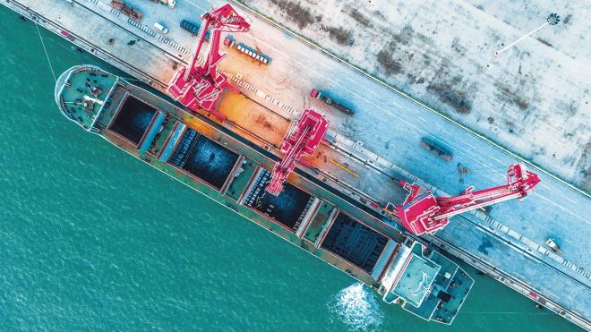 圖為2022年5月16日,首鋼京唐公司在京唐自有碼頭通過(guò)海運(yùn)把產(chǎn)品發(fā)往客戶。 (通訊員 玄龍 攝)