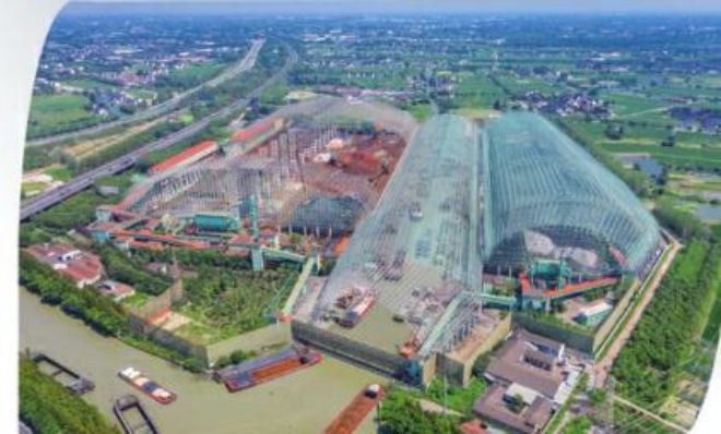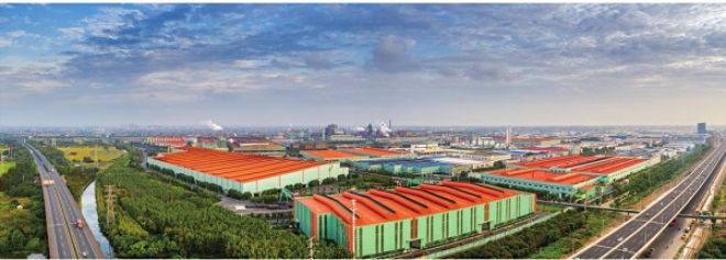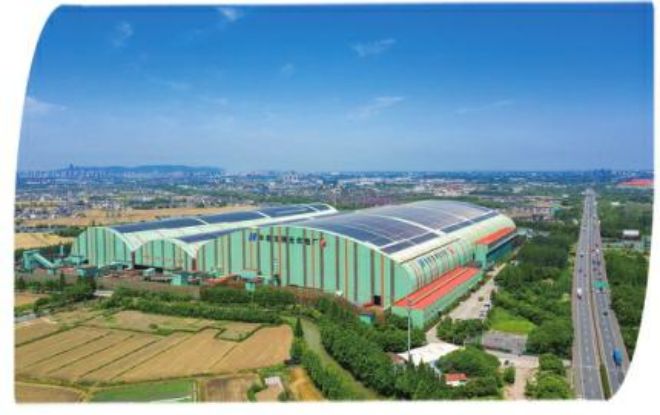 在從常熟市市區(qū)通往長江的高架橋途中,可以看到一大片墻體為綠色的廠房;聳立在廠區(qū)中間的高大煙囪以蔚藍色打底,上面繪著潔白的云朵;在廠房與廠房之間的空隙處,間或有樹冠探出屋面;在秋季明媚的陽光下,橘紅色的屋面熠熠生輝。