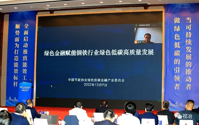 圖為張衛(wèi)東通過(guò)視頻作《綠色金融賦能鋼鐵行業(yè)綠色低碳高質(zhì)量》報(bào)告