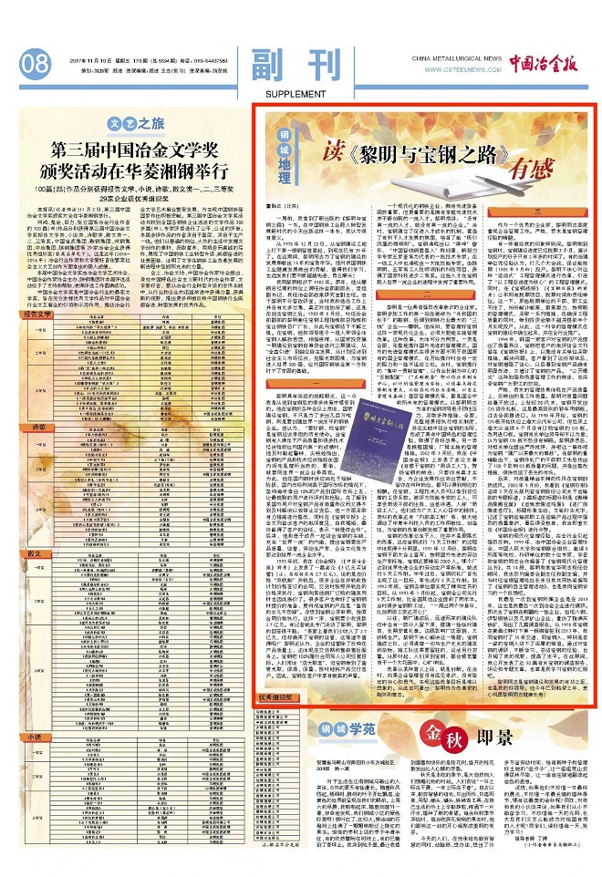 一周前,我拿到了新出版的《黎明與寶鋼之路》一書。在中國鋼鐵工業跨入轉型發展新時代的今天出版這樣一本書,我認為很有意義。