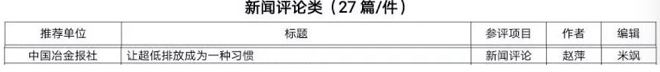由趙萍創(chuàng)作、米颯編輯的作品《讓超低排放成為一種習(xí)慣》獲得第34屆中國經(jīng)濟(jì)新聞獎新聞評論類三等獎。該作品肯定了鋼鐵行業(yè)超低排放改造成果,也明確指出了現(xiàn)存問題,為對達(dá)到超低排放的企業(yè)進(jìn)行動態(tài)調(diào)整、有效和長效監(jiān)管的新規(guī)叫好,防止個別企業(yè)對待超低排放心懷僥幸、投機(jī)取巧、消極懈怠的行為,社會效果明顯。