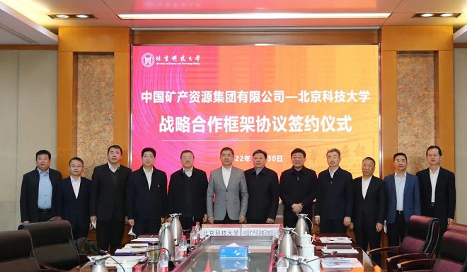 2022年12月30日,中國礦產資源集團與北京科技大學簽署戰略合作框架協議。中國礦產黨組書記、董事長姚林,北科大黨委書記武貴龍出席儀式并致辭。中國礦產總經理郭斌和北科大校長楊仁樹代表雙方簽署協議。中國礦產副總經理邵安林,北科大黨委副書記孫景宏、副校長閆相斌出席儀式。