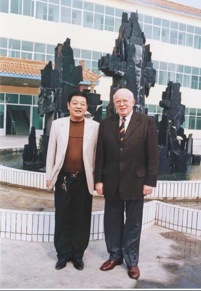 圖為張建武(左)生前在該公司辦公樓前接待來訪外賓