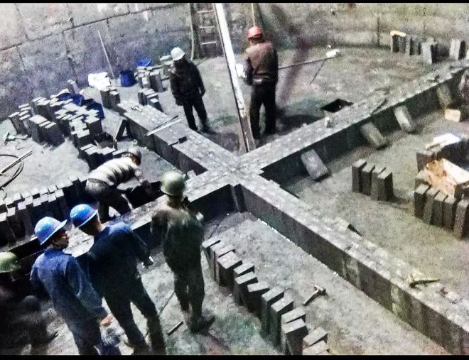 圖為五耐高爐長壽產品——碳復合磚正砌筑在某大型高爐爐膛