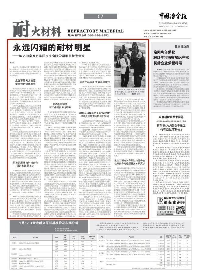 2016年11月10日和2019年5月29日,《中國冶金報》先后兩次在頭版頭條,對五耐碳復合磚予以重點報道。從此,該專利產品遐邇中外,用戶紛至沓來。到目前為止,全國已有近200多座高爐采用了五耐碳復合磚,不僅取得了安全長壽的使用效果,而且為煉鐵廠節約成本、降低消耗和維護費用立下了汗馬功勞。事實證明,該產品不僅性能優于國外進口同類產品,而且完全可以替代進口產品,更可以在全國大高爐上廣泛采用。