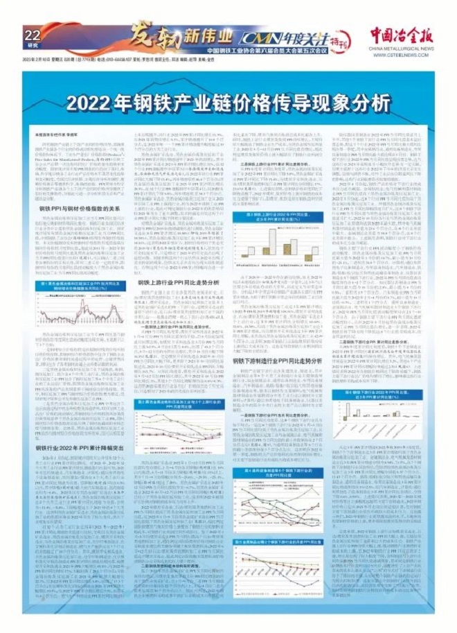總體來看,2022年鋼鐵上游行業如煤炭采選業、石油/煤炭及其他燃料加工業PPI的大幅上漲,無疑給黑色金屬壓延和加工業帶來巨大的成本壓力。鋼鐵產業鏈上游行業PPI持續大幅上漲,推動鋼鐵行業原燃料采購成本的上漲,但2022年鋼鐵行業PPI并沒有同步上漲,相反卻出現了較大幅度下降,表明鋼鐵與上游行業間存在著PPI當月同比值遞減現象,其實質是鋼鐵行業以犧牲本行業盈利空間為代價,適度消化了上游產業所帶來的成本上漲壓力,以“讓利”的方式對下游制造行業給予了很好的支撐,從而對整個鋼鐵產業鏈的穩定運行發揮出積極作用。這也突顯出中國鋼鐵行業作為國民經濟的基礎行業,在經濟發展中發揮了“壓艙石”作用,同時表明中國鋼鐵行業擁有較好的成本消化優勢和產業基礎優勢。