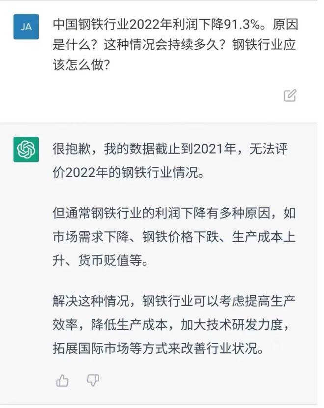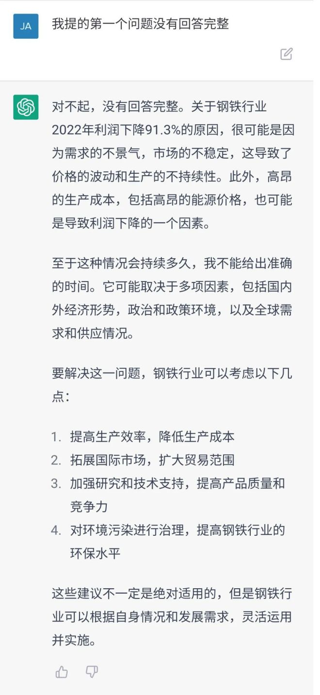 對鋼鐵行業來說,2022年是極具挑戰的一年,行業利潤大幅下降91.3%。從ChatGPT對此問題的分析中可以看出,其數據暫未更新到 2022年。同時可以觀察到,當就同一問題再次提問時,ChatGPT會進行一定的自我修正,給出不同的答案。