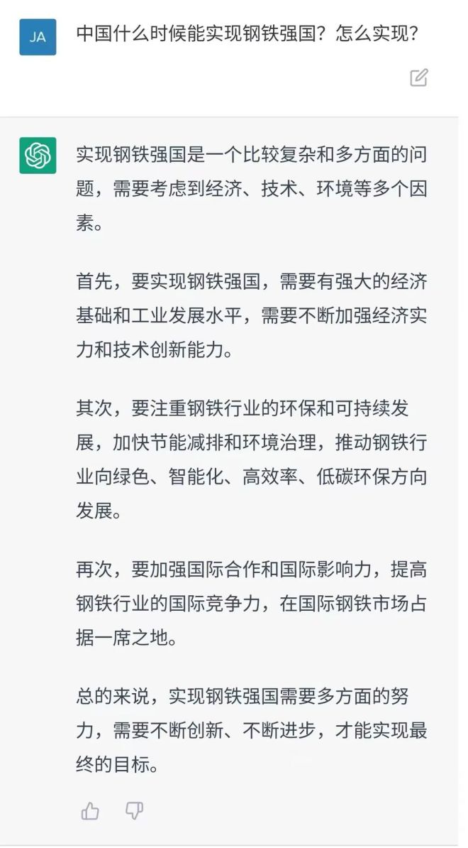 實現鋼鐵強國是中國鋼鐵行業的奮斗目標。對于實現鋼鐵強國的路徑,ChatGPT給出了自己的答案。