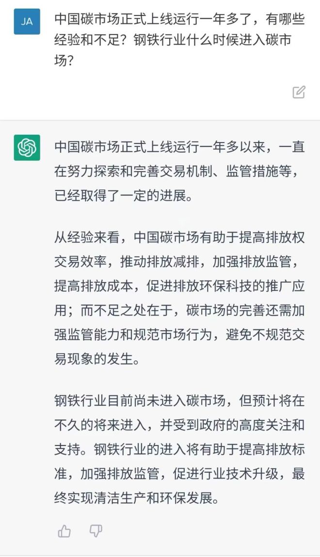 2021年7月16日,電力行業(我國碳排放占比最大的行業)成為首個被納入全國碳市場的行業。有專家稱,中國鋼鐵將在不久的將來被納入碳市場,ChatGPT的判斷與之基本一致。