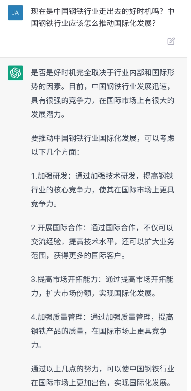 黨的二十大提出,堅持高水平對外開放,加快構建以國內大循環為主體、國內國際雙循環相互促進的新發展格局。同時,2022年12月份,中共中央國務院印發的《擴大內需戰略規劃綱要 (2022-2035年)》提出,堅定實施擴大內需戰略、培育完整內需體系,是加快構建新發展格局的必然選擇。在此種情況下,中國鋼鐵行業對國際化議題正在進行更深入的思考。對此,ChatGPT的回答是——