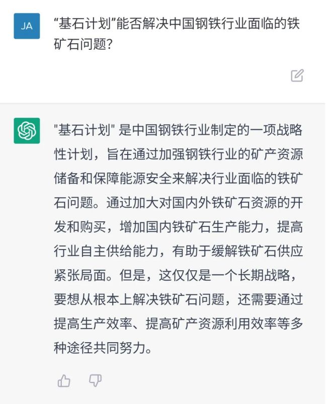 70%~80%的進口鐵礦石依存度,讓中國鋼鐵行業面臨原材料“卡脖子”風險。2021年1月份,中國鋼鐵工業協會重磅推出“基石計劃”,“三管齊下”破解鐵礦石資源難題。ChatGPT對這一問題的回答非常“接地氣”,也很符合實際情況。