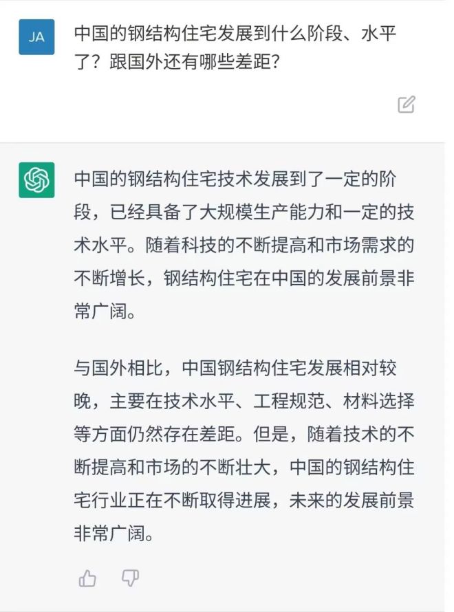 在日本每年新建的20萬棟低層住宅中,鋼結構住宅占市場份額的70%以上。整體來看,國外的鋼結構住宅系統在標準化生產、組裝施工、節能、防火、抗震等方面已經非常成熟。而我國的鋼結構住宅發展仍在積極推進中。ChatGPT對鋼結構住宅的未來發展持樂觀態度。