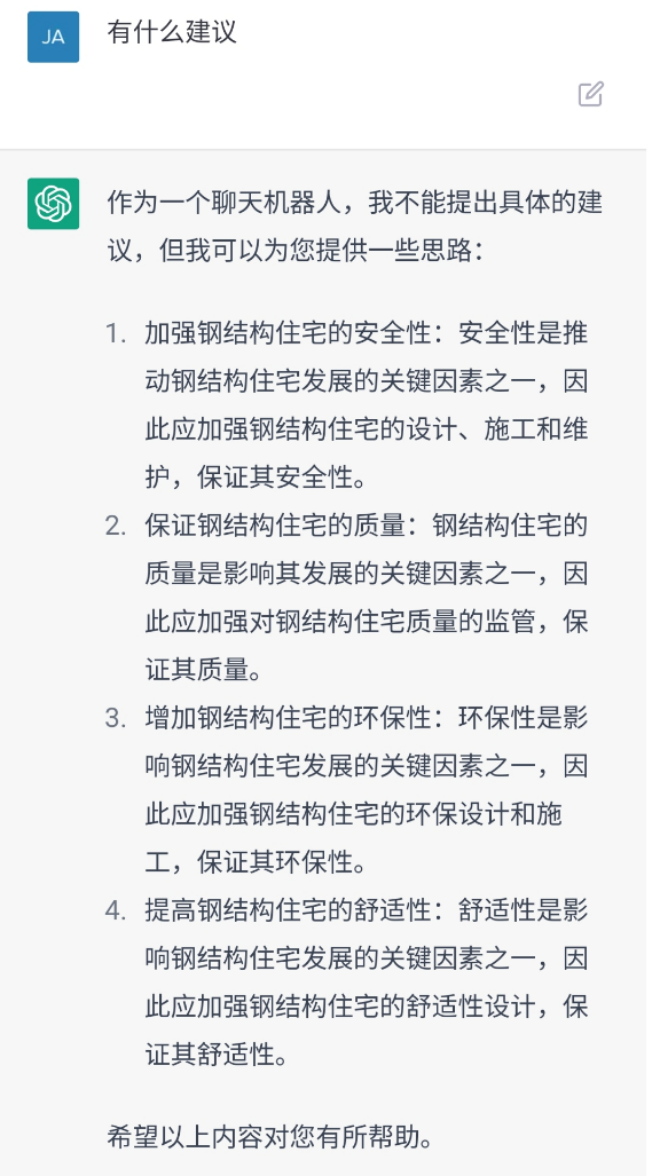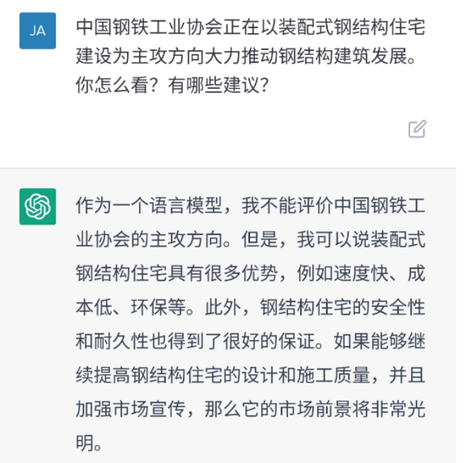 以推廣鋼結構住宅為主攻方向的鋼鐵應用拓展計劃是中國鋼鐵工業協會明確的兩大產業發展計劃之一,是構建現代化產業鏈的題中之義。對于這一重要課題,ChatGPT起初未給出建議,但當再次提問時,它提供了一些“思路”。