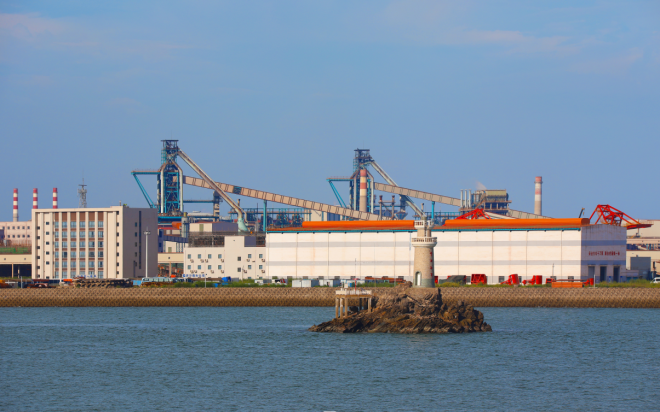 圖為海上眺望防鋼基地。(蔣國華攝)