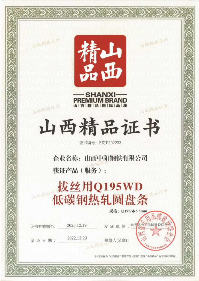 4月27日,在首屆“山西精品”授牌儀式上,中陽鋼鐵產(chǎn)品拔絲用Q195WD低碳鋼熱軋圓盤條被授予“山西精品”稱號,標(biāo)志著該企業(yè)品牌建設(shè)再上新臺階。