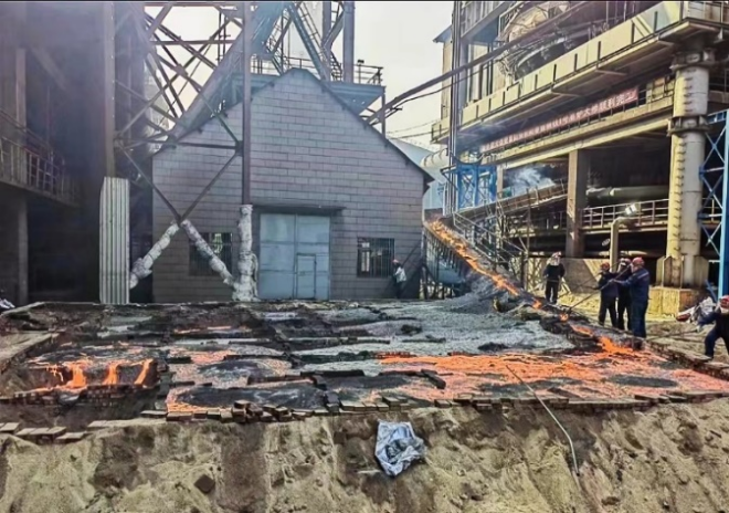 圖為在由聯合榮大總包的陽春新鋼1#高爐快速大修工程中,施工隊正在儲鐵地坑放凈殘鐵。