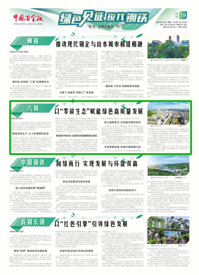未來(lái),六鋼將以“零碳生態(tài)”為目標(biāo),秉承“綠水青山就是金山銀山”的理念,牢固樹(shù)立綠色低碳意識(shí),傾力建設(shè)綠色六鋼、環(huán)保六鋼、生態(tài)六鋼。