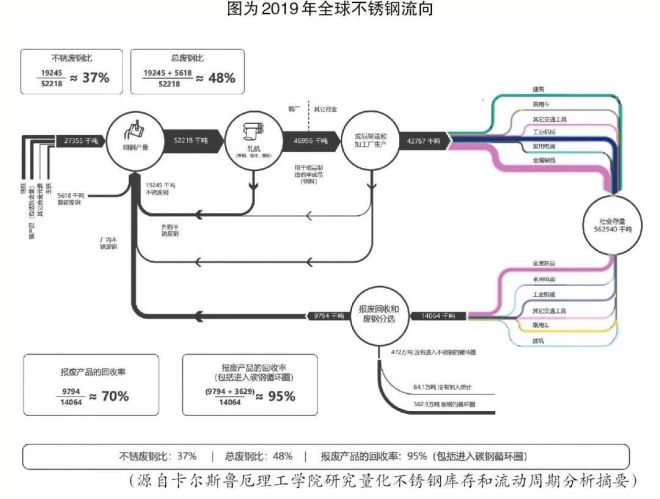 這項研究通過分析2019年全球不銹鋼流向展示了不銹鋼的生命周期,包括原材料、生產制造過程、成品,以及成品報廢后產生的廢鋼的流動情況(見圖)。