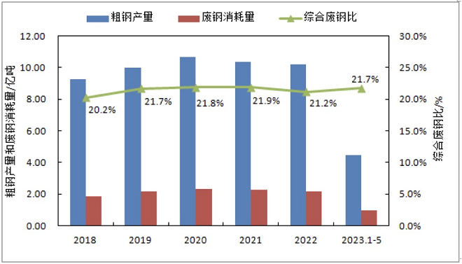2023年 1-5月,我國粗鋼產量44463萬噸,同比增長1.6%;生鐵產量37474萬噸,同比增長3.2%;廢鋼鐵消耗總量9659萬噸,同比減少367萬噸,降幅3.7%;綜合廢鋼單耗217.2公斤/噸,同比減少13.3公斤/噸,降幅5.8%,其中:轉爐廢鋼單耗172公斤/噸,同比減少9.3公斤/噸,降幅5.1%,電爐廢鋼單耗628.6公斤/噸,同比減少18.2公斤/噸,降幅2.8%;廢鋼比21.72%,同比減少1.33個百分點;電爐鋼比9.91%,同比減少0.65個百分點。