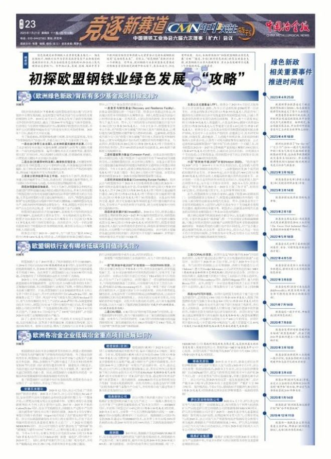 綠色低碳是世界鋼鐵工業重要發展主題之一。相關數據統計,鋼鐵行業作為資源消耗密集型產業和典型的高碳排放行業,約占全球能源總消耗的8%和全球二氧化碳排放總量的7%。今年初以來,英國、德國、西班牙等多個歐洲國家陸續宣布將投入大量資金以支持本國鋼鐵制造商“走向綠色未來”。實際上,“綠色鋼鐵”在歐洲并非一個新概念。近年來,歐洲鋼鐵行業在歐盟各成員國政府根據自身實際制定的碳中和目標下,雖承壓運行,但也有所收獲。為此,本版特別組織“初探歐盟鋼鐵業綠色發展‘攻略’”報道,介紹《歐洲綠色新政》的背后的基金支持、歐盟鋼鐵行業重點低碳項目、重點企業低碳項目進展3個方面的內容,以饗讀者。