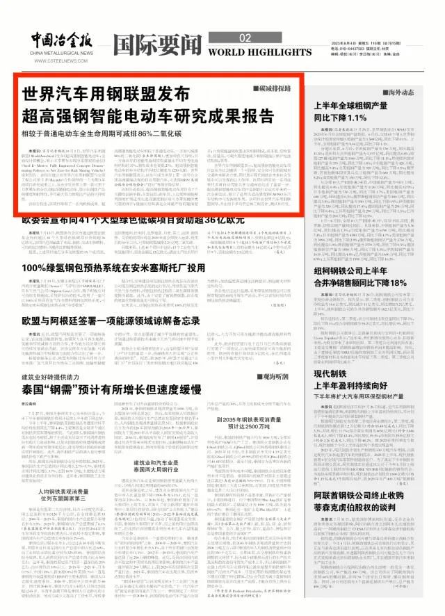 該報告指出,該項目取得了一系列積極成果。超高強鋼智能電動車相較于普通電動車,一方面可減排86%的二氧化碳(全生命周期),更加綠色可持續;另一方面該車的智能電池組結構重量比平均參考電池組結構輕37%,制作成本也要低27%。超高強鋼智能電動車的車身結構平均抗拉強度為1259兆帕。世界汽車用鋼聯盟表示,該車可成為世界上第一款符合全球高速碰撞法規的自動駕駛汽車,可獲得IIHS(美國公路安全保險協會)“良好”等級評級結果。