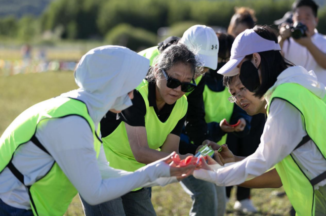 在拓展活動的最后,大家圍坐在草坪上,手中握著同一條繩索,每個人盡全力才能拉成一個標準的圓。大家拉緊繩索,揮舞雙臂上—左—下—右旋轉,感受彼此支撐的團結力量。正如一代又一代護林人所傳達的塞罕壩精神,只有艱苦奮斗、甘于奉獻、團結一致,才能讓黃沙遮天的茫茫荒原變為如今林的海洋。