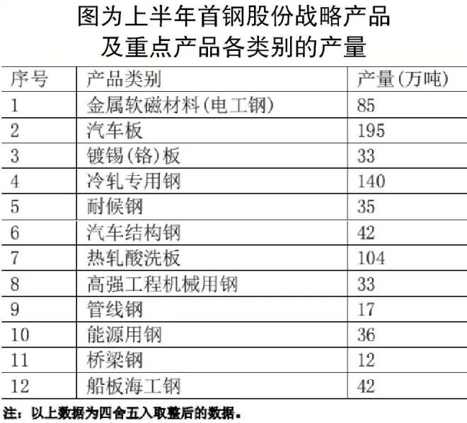 首鋼股份表示,上半年,公司堅(jiān)持電工鋼持續(xù)引領(lǐng)、汽車板做精做強(qiáng)、鍍錫板高端突破的發(fā)展戰(zhàn)略,實(shí)現(xiàn)產(chǎn)品質(zhì)量和效益雙提升。“上半年,三大戰(zhàn)略產(chǎn)品(電工鋼、汽車板、鍍錫(鉻)板)產(chǎn)量合計(jì)為313萬(wàn)噸,占公司鋼材總產(chǎn)量的27%;九類重點(diǎn)產(chǎn)品(冷軋專用鋼、熱軋酸洗板、耐候鋼、能源用鋼、汽車結(jié)構(gòu)鋼、高強(qiáng)工程機(jī)械用鋼、管線鋼、橋梁鋼、船板海工鋼)產(chǎn)量為461萬(wàn)噸,占公司鋼材總產(chǎn)量的39%。”可見(jiàn),首鋼股份戰(zhàn)略及重點(diǎn)產(chǎn)品占比已達(dá)66%,占據(jù)絕對(duì)比重。