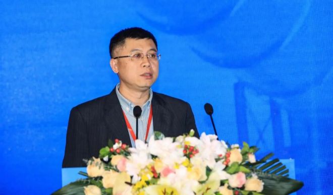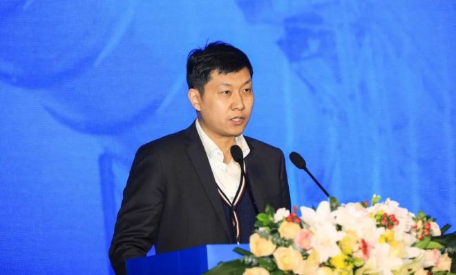 圖為朱毅做《發(fā)展高品質(zhì)UHP石墨電極 為鋼鐵行業(yè)轉(zhuǎn)型升級服務(wù)》主題報(bào)告。