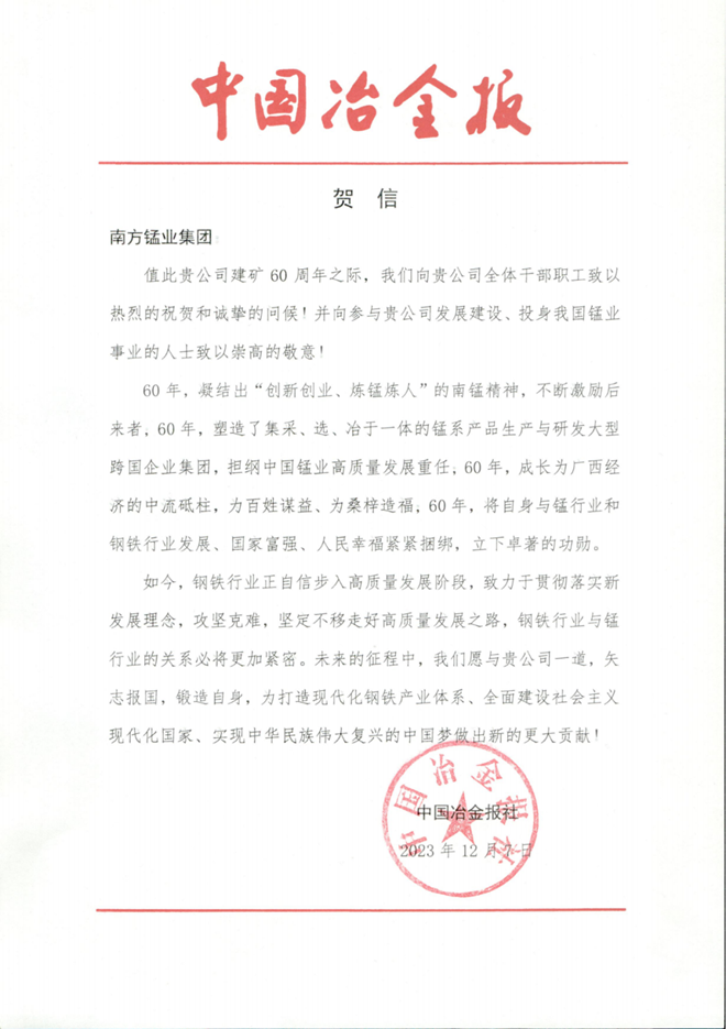 值此貴公司建礦60周年之際,我們向貴公司全體干部職工致以熱烈的祝賀和誠摯的問候!并向參與貴公司發展建設、投身我國錳業事業的人士致以崇高的敬意!