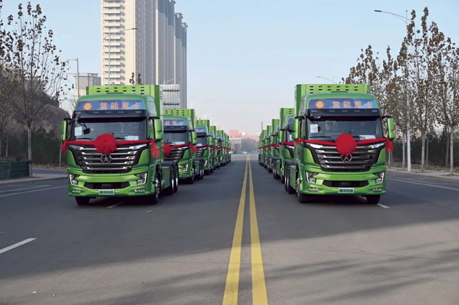 圖為河北省辛集市氫能產業大會澳森特鋼交車儀式現場整齊排列的氫能重卡。(裴躍騰 攝)