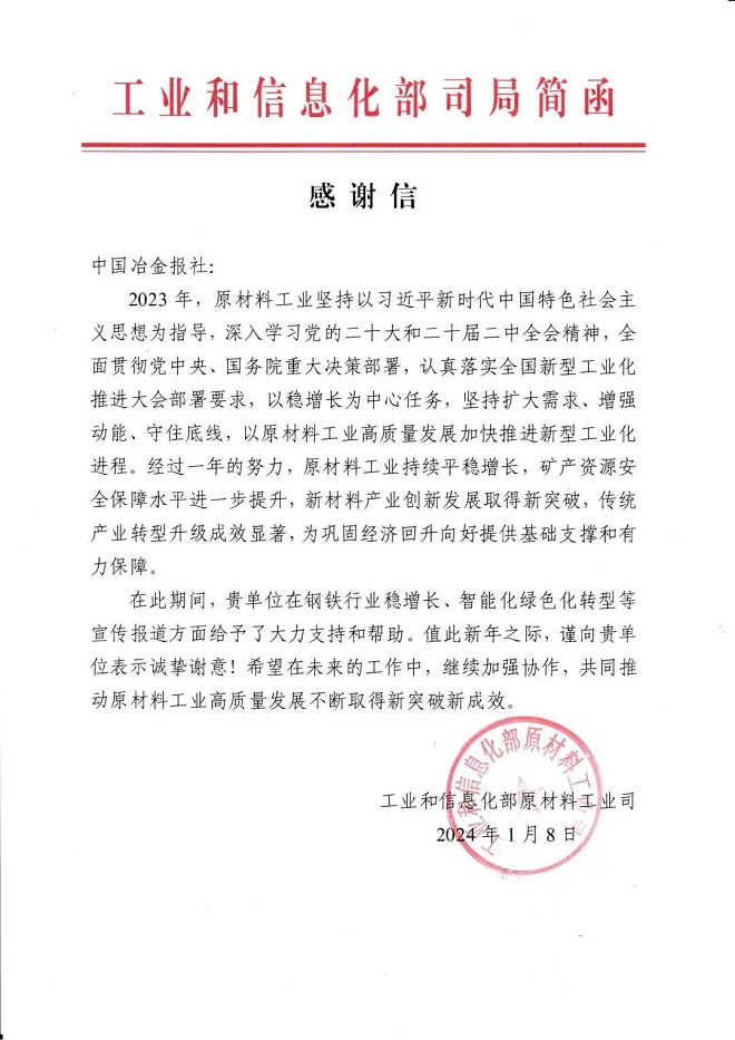 1月8日,工業和信息化部原材料工業司向中國冶金報社發來感謝信,感謝報社在鋼鐵行業穩增長、智能化綠色化轉型等宣傳報道方面給予了大力支持和幫助。希望在未來的工作中,繼續加強協作,共同推動原材料工業高質量發展不斷取得新突破新成效。