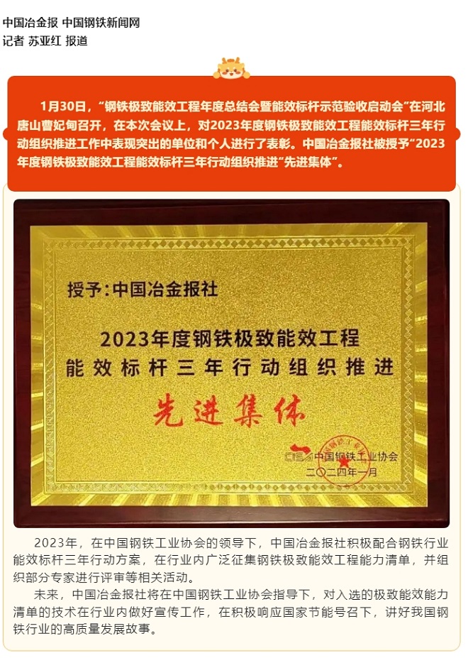 喜報(bào)!中國(guó)冶金報(bào)社榮獲“2023年度鋼鐵極致能效工程能效標(biāo)桿三年行動(dòng)組織推進(jìn)先進(jìn)集體”