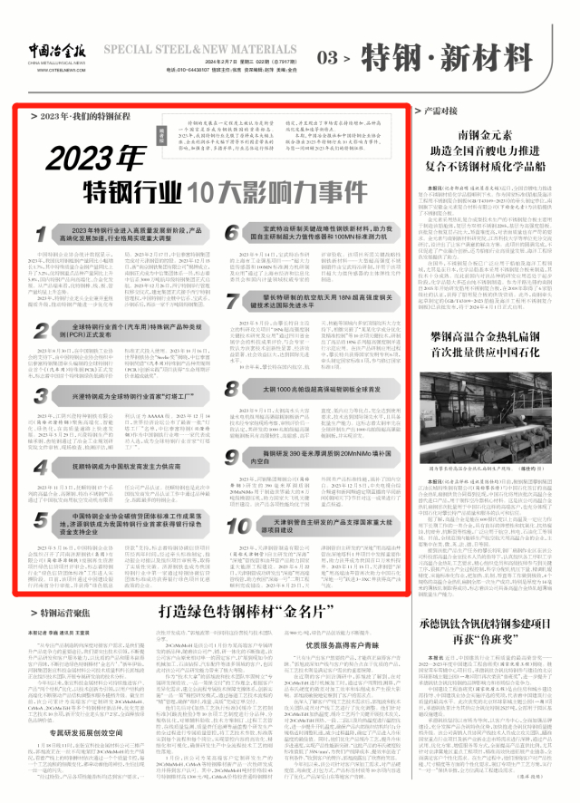 本期,中國冶金報社和中國特鋼企業協會聯合推出2023年特鋼行業10大影響力事件,與您一同回顧2023年我們的特鋼征程。