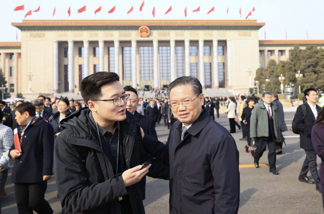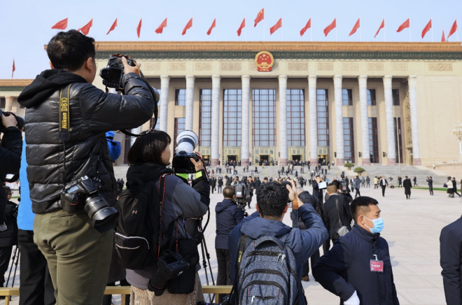 等待采訪拍攝委員的記者們一直等候在人民大會堂前