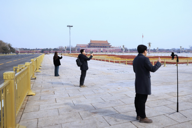 在天安門廣場上第一時間用短視頻報道全國政協十四屆二次會議閉幕會的媒體記者們