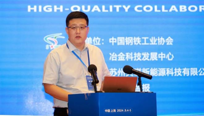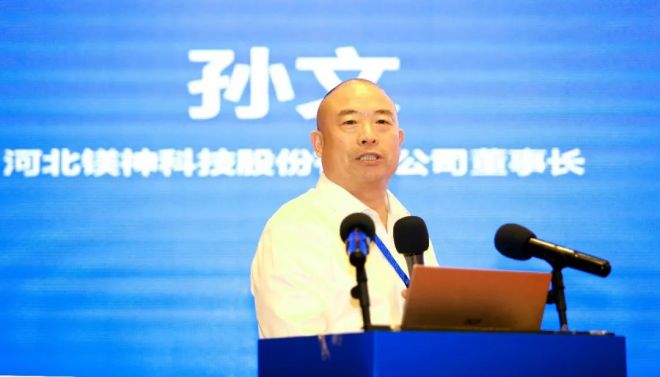 圖為孫文做《全球取向硅鋼氧化鎂應用技術及鎂神解決方案》的報告