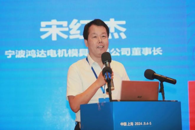 圖為宋紅杰做《新能源汽車驅動電機鐵心應用快速自粘結技術》的報告