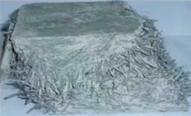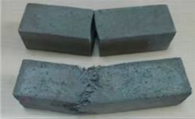 爐腹爐腰預掛渣皮技術是將金屬陶瓷材料澆注于冷卻壁表面,在冷卻壁表面形成一層永久性的人造渣皮保護層。該材料將金屬纖維引入到非金屬澆注料中,將兩者的優點相結合,提高材料的抗折抗壓等物理指標,提高材料的導熱能力,延長爐腹、爐腰區域耐材的使用壽命。在350℃條件下,導熱系數20W/(K·m)左右;鋼纖維含量達到40%左右,不是普通的高鋼纖維澆注料(10%以下),其200℃以下抗折強度可達到35MPa~40MPa,在實驗室常規抗折檢測設備都無法將其壓彎,而折后的材料也不“折而不斷”。下圖為預掛渣皮材料的物理檢測圖。