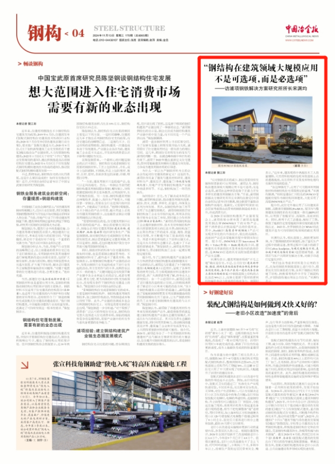 “應對鋼鐵需求的減少,鋼企需要持續發掘和探索新的可應用領域。浦項認為,鋼結構在建筑領域大規模應用不是可選項,而是必選項,浦項在這種背景趨勢下正著力開發多樣化的建筑用鋼解決方案。”日前,浦項鋼鐵解決方案研究所所長宋淵均在接受《中國冶金報》記者專訪時強調,鋼企既要盡量推動鋼構件高端化、低碳化,又需要呼吁國家/社會層面考慮到由此帶來的鋼鐵制造成本的上升,形成消費共識。