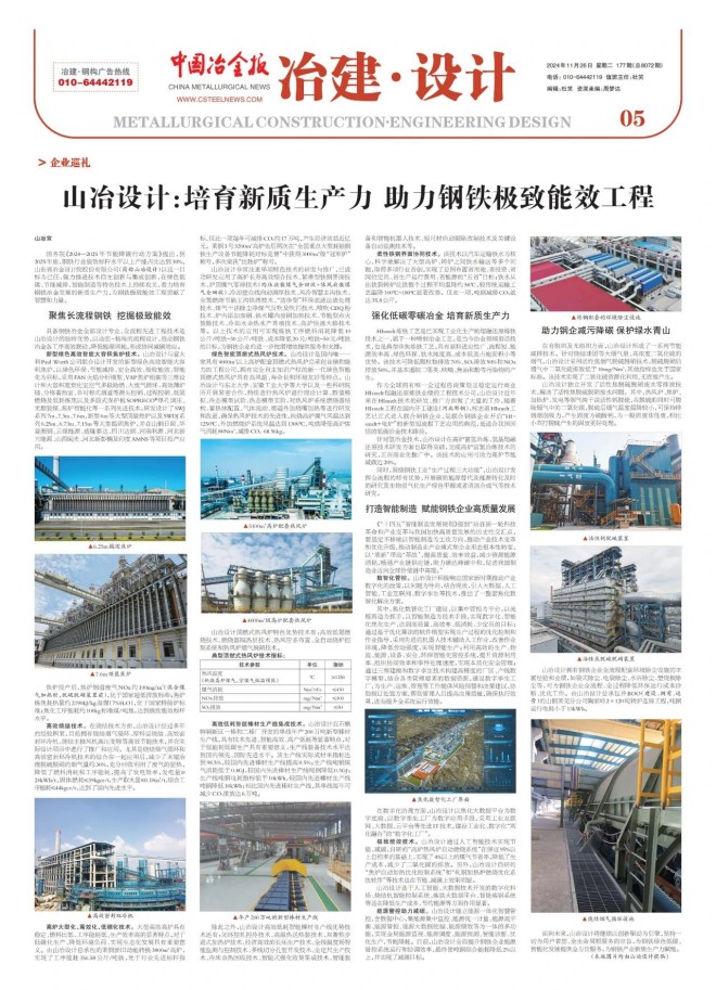 國務院《2024—2025年節能降碳行動方案》提出,到2025年底,鋼鐵行業能效標桿水平以上產能占比達到30%。山東省冶金設計院股份有限公司(簡稱山冶設計)以這一目標為己任,強力推進技術自主創新與集成創新,在綠色低碳、節能減排、智能制造等特色技術上持續攻關,著力培育鋼鐵冶金發展的新質生產力,為鋼鐵極致能效工程貢獻了智慧和力量。