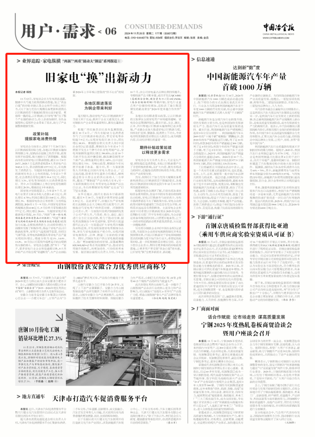另有部分鋼鐵企業向《中國冶金報》記者反饋,當前部分企業的家電板銷售情況并未達到預期效果,目前以舊換新對于家電領域鋼鐵需求的刺激力度不如汽車行業大,希望延續政策補貼,進一步拓展鋼鐵需求增長空間。還有少部分企業表示,期待有更多城市的補貼政策落地,讓更多用戶享受到“真金白銀”的實惠,讓舊家電“換”出更多新需求、新動能。