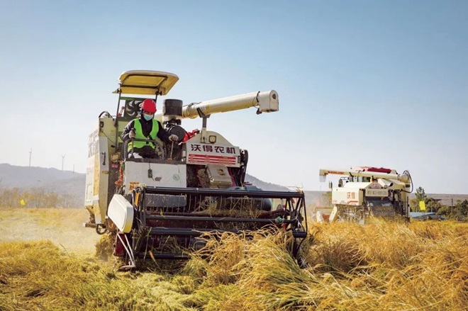 周邊村莊種糧能手正駕駛農(nóng)用收割機(jī)開(kāi)鐮收割。 (冷天馳 攝)
